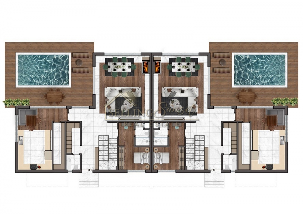 UDOGODNIENIA W KOMPLEKSIE: zewnętrzny basen, system inteligentnego domu, rolety elektryczne, miejsce do opalania, garaż kominek, jacuzzi, łaźnia turecka, sauna, miejsce do grilla, system kamer bezpieczeństwa
